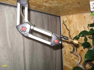 Um die Tiere auch mit der nötigen UVB-Strahlung zu versorgen, habe ich mir einen "eigenen UVB-Strahler" gebaut. Hierzu verwende ich ein Kamerastativ mit einem selbstgebauten Halter für die Glühbirne. Den Halter für die Glühbirne habe ich aus einem Stück Edelstahlblech, einem Stück ALU-Profil und einer Keramikfassung gebaut.